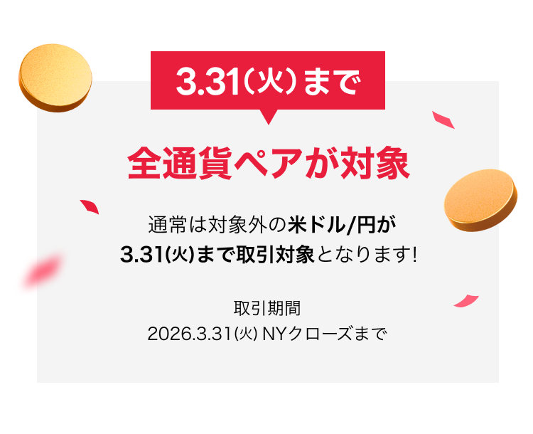 ⇒2026年3月31日(火)NYクローズまでの取引に関しては、米ドル/円も対象となります。