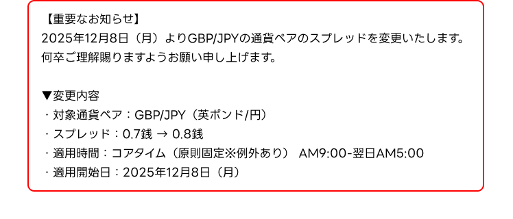 ※コアタイムスプレッドは各営業日「AM9:00 - 翌日AM5:00」の時間帯で提供(例外あり)。 市場の急変時(震災などの天変地異・各国中央銀行の市場介入・その他外部要因)、 市場の流動性が低下している状況(米国東部時間午後5時前後・年末年始・クリスマス時期など)や重要指標発表時間帯などにより、 スプレッドが拡大する場合があります。