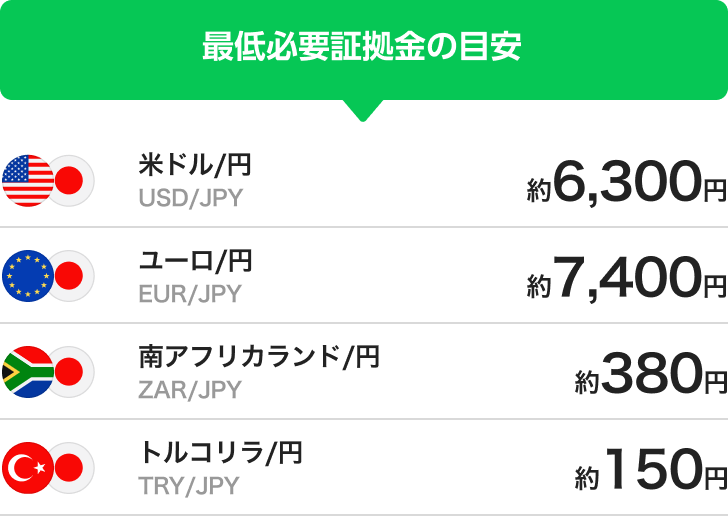 ※各通貨ペアで取引を始めるために必要な最低証拠金の目安です。証拠金維持率が100%未満になった場合、ロスカットが執行されますので、余裕を持ったご入金をお願いいたします。